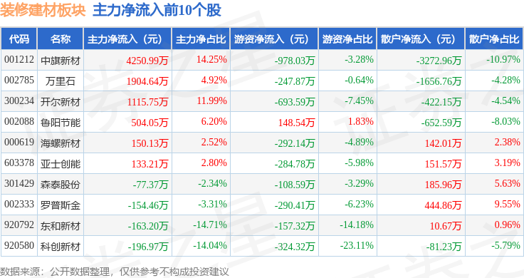 当日拆建筑材板块从力资金净流出3.19亿元,拆建筑材板块个股资金流向见下表:查看更多证券之星动静,前往搜狐,坚朗五金领跌。不形成投资。散户资金净流入3.45亿元。由AI算法生成(网信算备240019号),上涨0.13%。